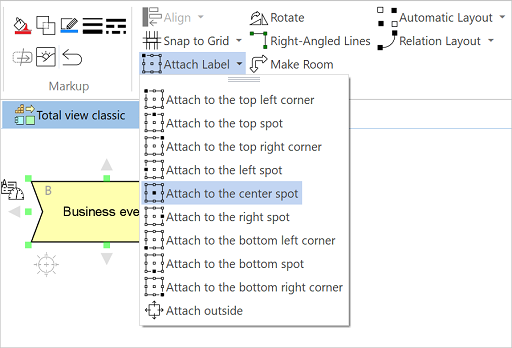 To position a label, select the object with the label in the diagram or view, click Home > Attach Label and click the desired label position.