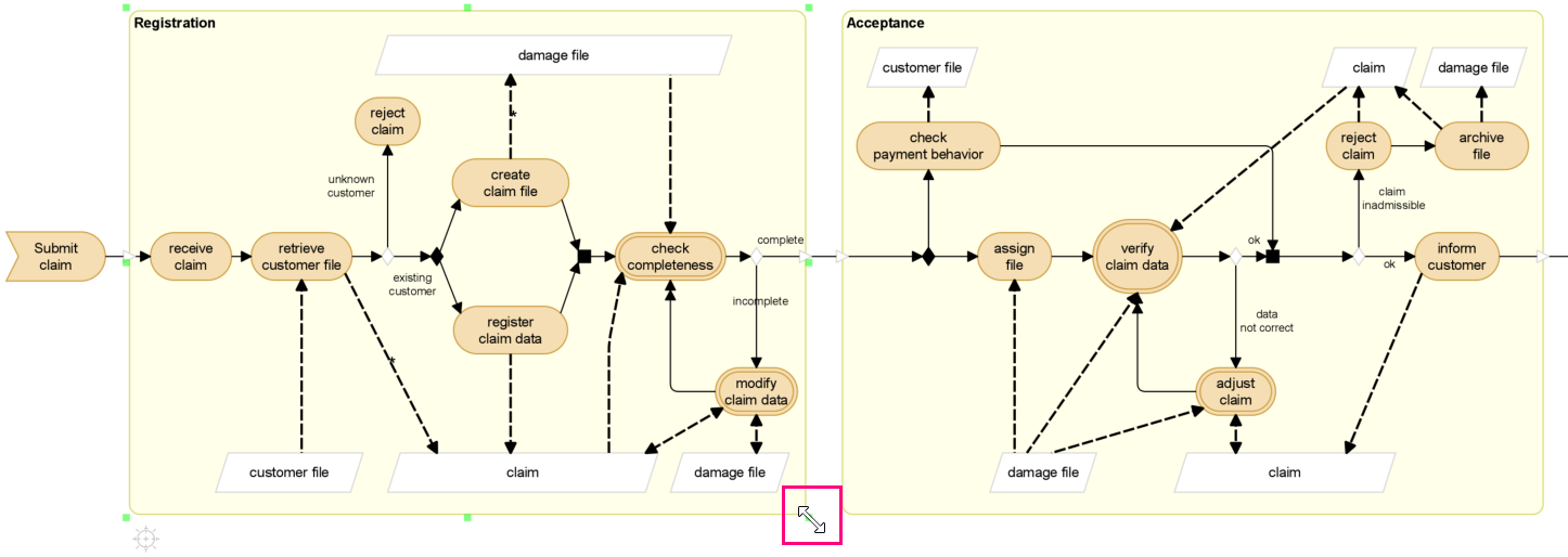 Sub-processes in Amber models can also be scaled. First select the sub-process. Then, select one of the blocks on the border of the sub-process, and drag it to the desired direction. The sub-process can be scaled independently in both directions (horizontally and vertically). The content of the sub-process keeps its scale. The sub-process can not be made smaller than its contents.