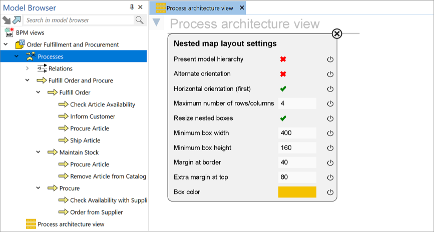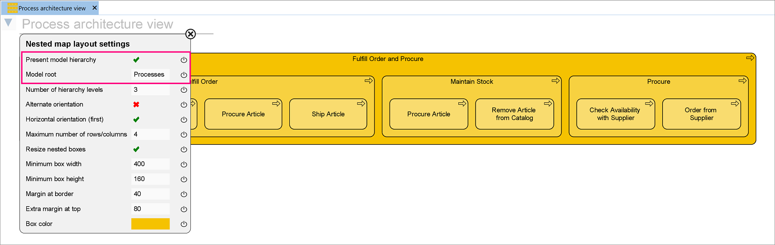The result is a Process architecture view displayed following the latest settings. When new objects are added to the model root structure or deleted from there, click